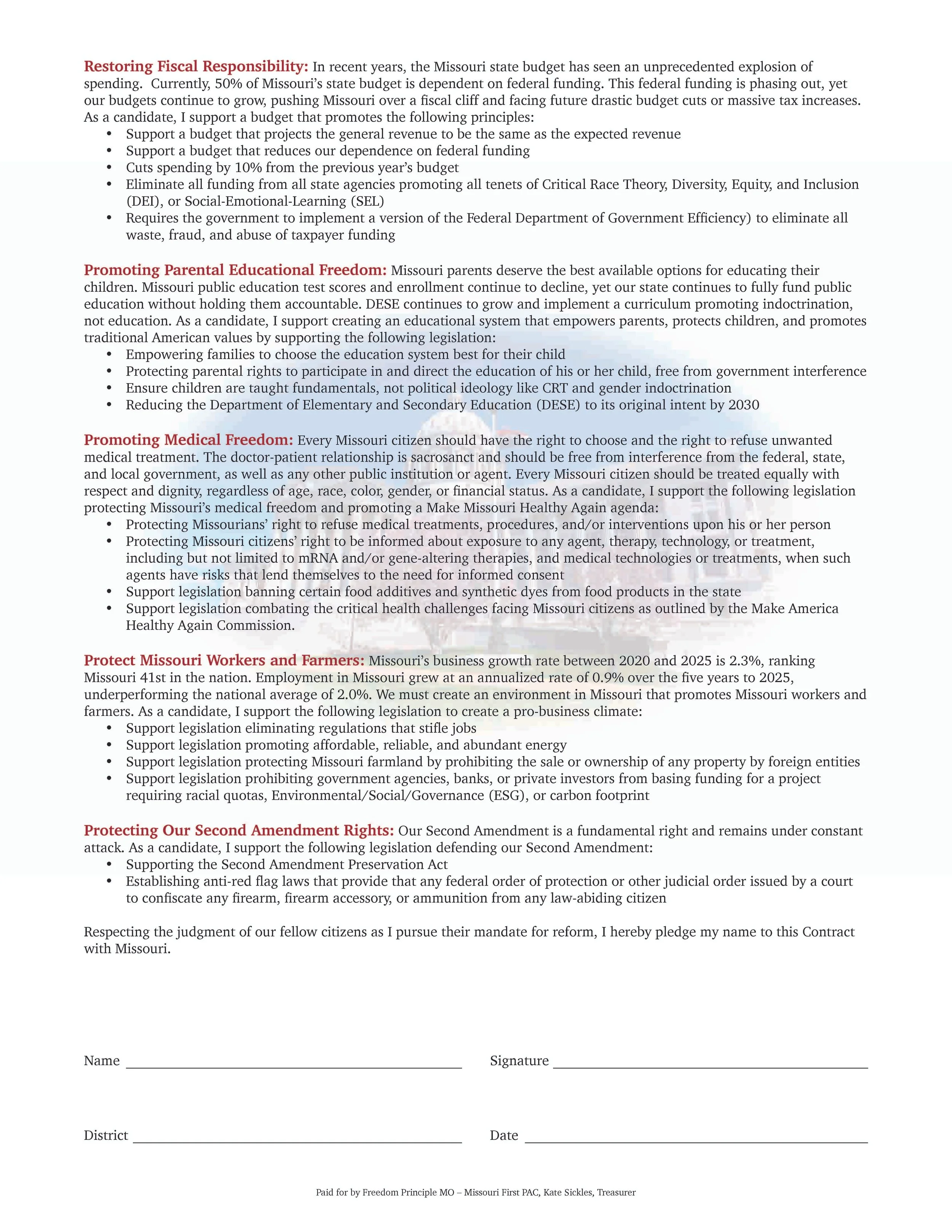 This contract isn't just a set of promises—it's a roadmap to reclaim Missouri's future. By signing, candidates affirm their dedication to these reforms, respecting the judgment of Missouri citizens and pursuing a mandate for real change.