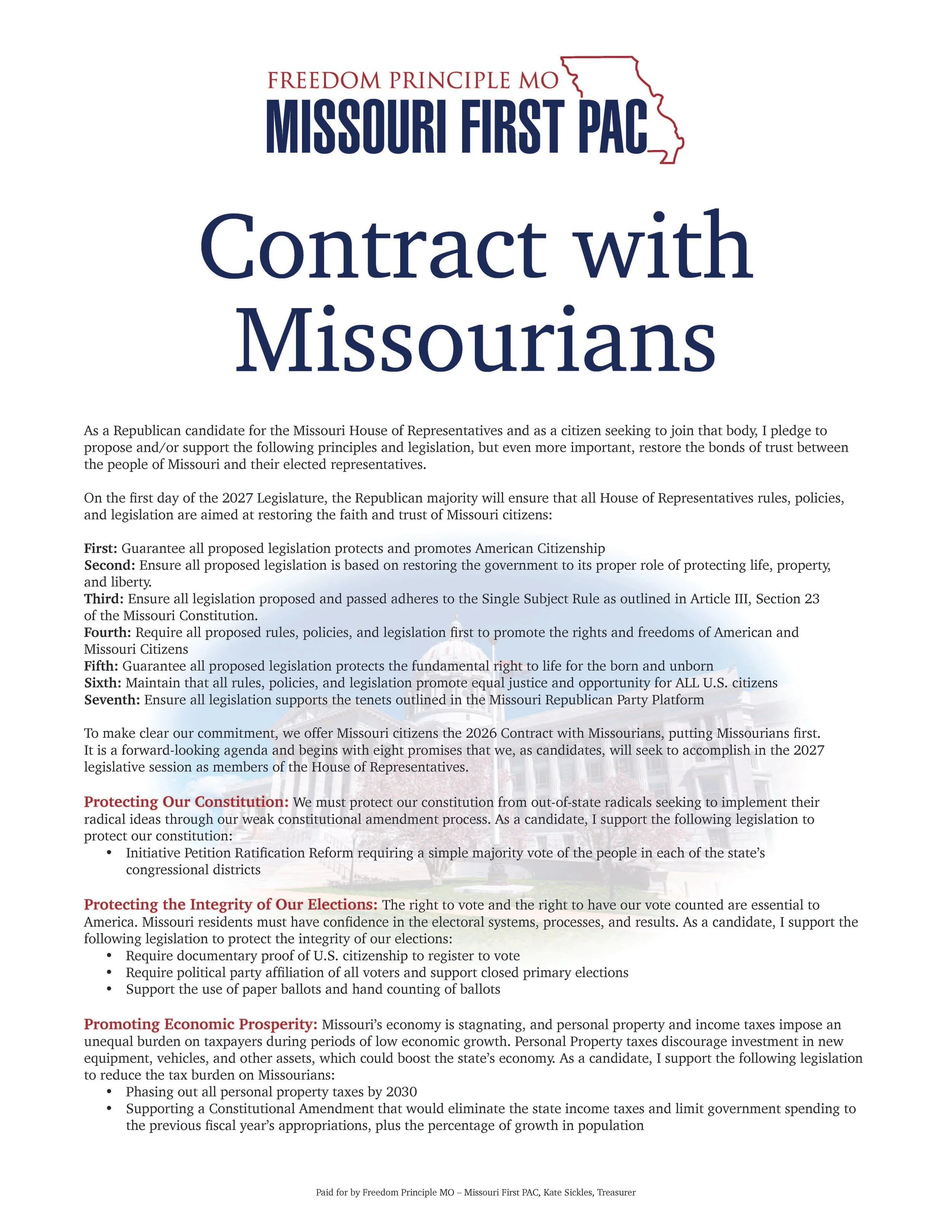In an era where trust in government has been eroded by overreach, mismanagement, and outside influences, the Freedom Principle MO – Missouri First PAC is proud to introduce the 2026 Contract with Missourians. This forward-looking agenda serves as a binding commitment for Republican candidates seeking to represent the people of Missouri in the House of Representatives and Senate. Rooted in conservative principles, the contract is designed to restore faith in our elected officials, protect our constitutional rights, and drive prosperity for every Missourian.