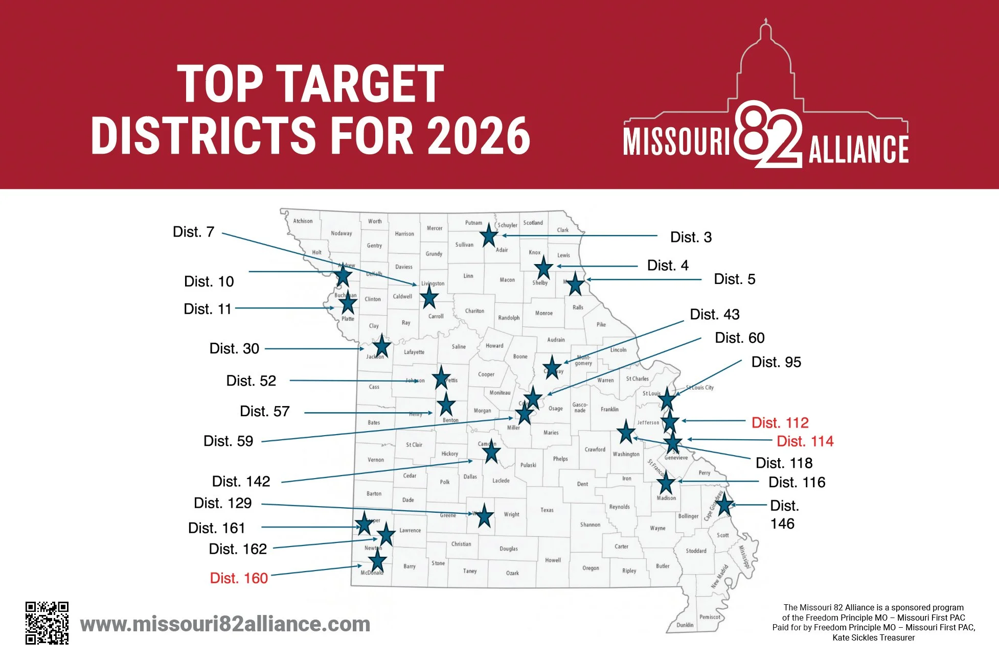 When you look at the playing field, Missouri will have more than 30 Republican open seats coming up in 2026. At least 20 of these Republicans terming out have an American Conservative Union grade of āCā or less. The Missouri 82 Alliance is targeting these 20 districts to try and elect more conservative candidates in the August 2026 primary. The Missouri 82 Alliance may also be targeting other open seats of candidates.